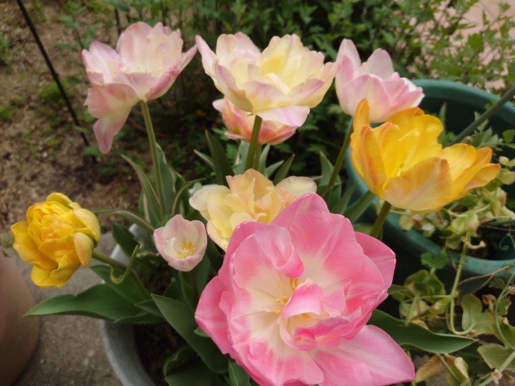 お庭には色とりどりのチューリップがきれいに咲いています。