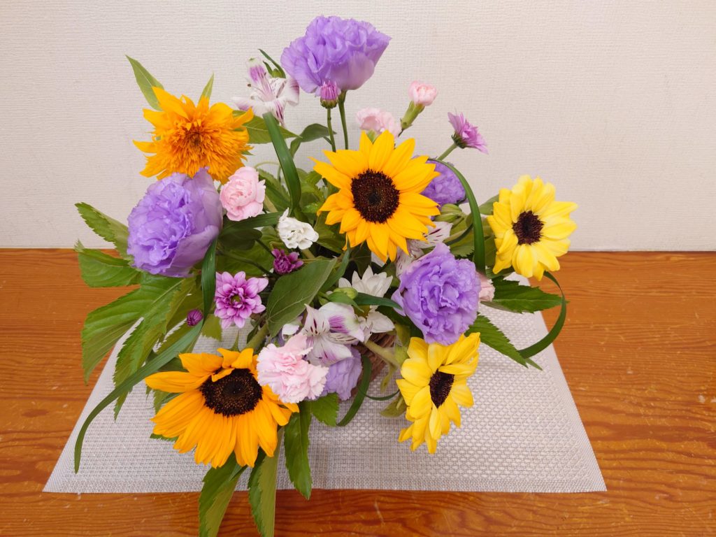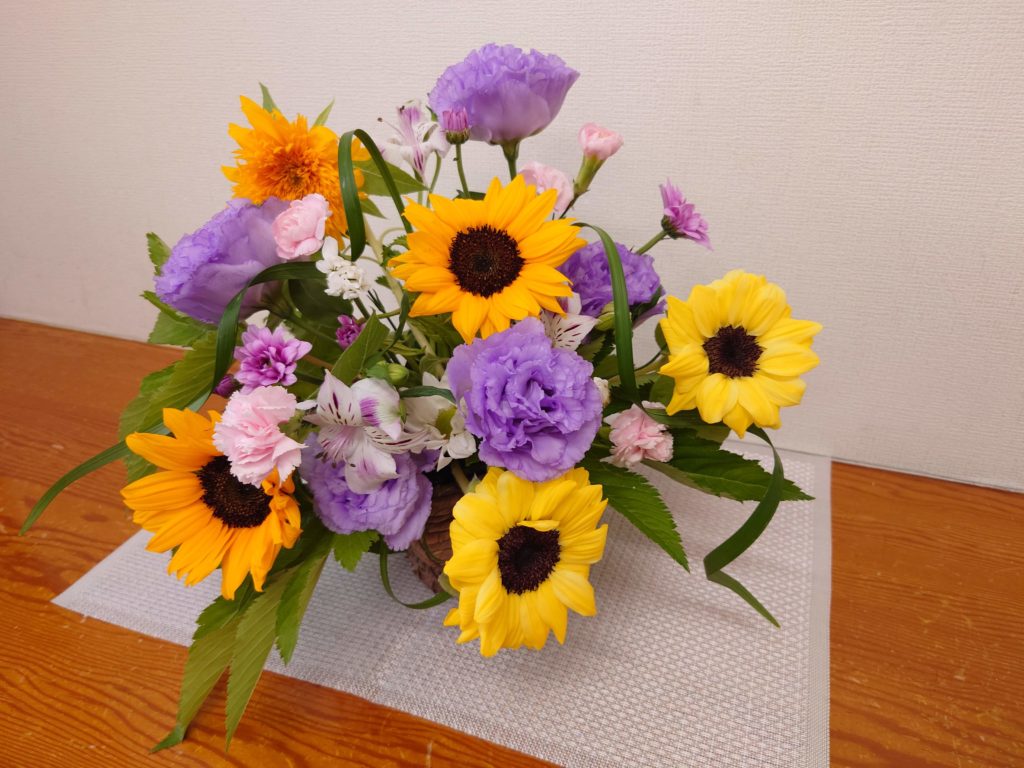 お家に持って帰ってきたひまわりのアレンジメント、エネルギーあふれ、元気をもらえています。