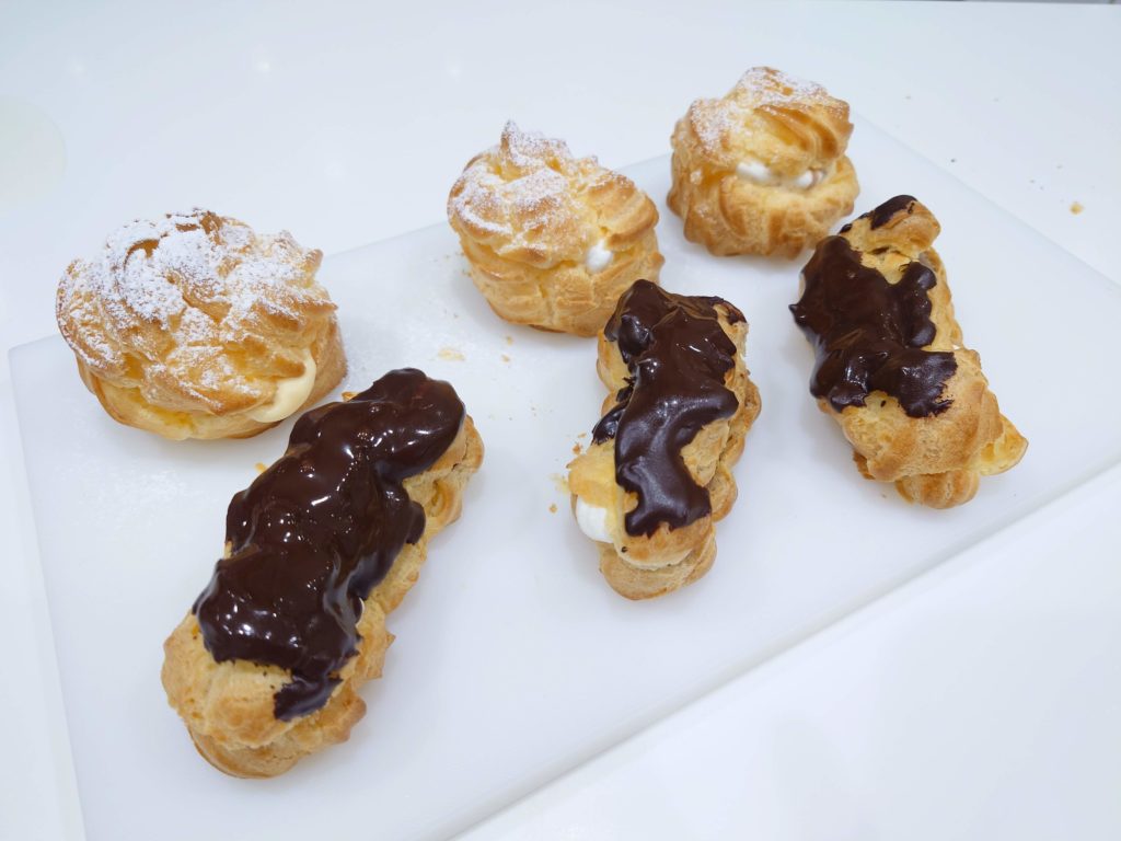シュークリームは工程が多くて大変との先生の前評判、シュー生地が透明になるまで根気よく練り上げました。そしてシュー生地を形よく絞るのもちょっとしたコツがいります。