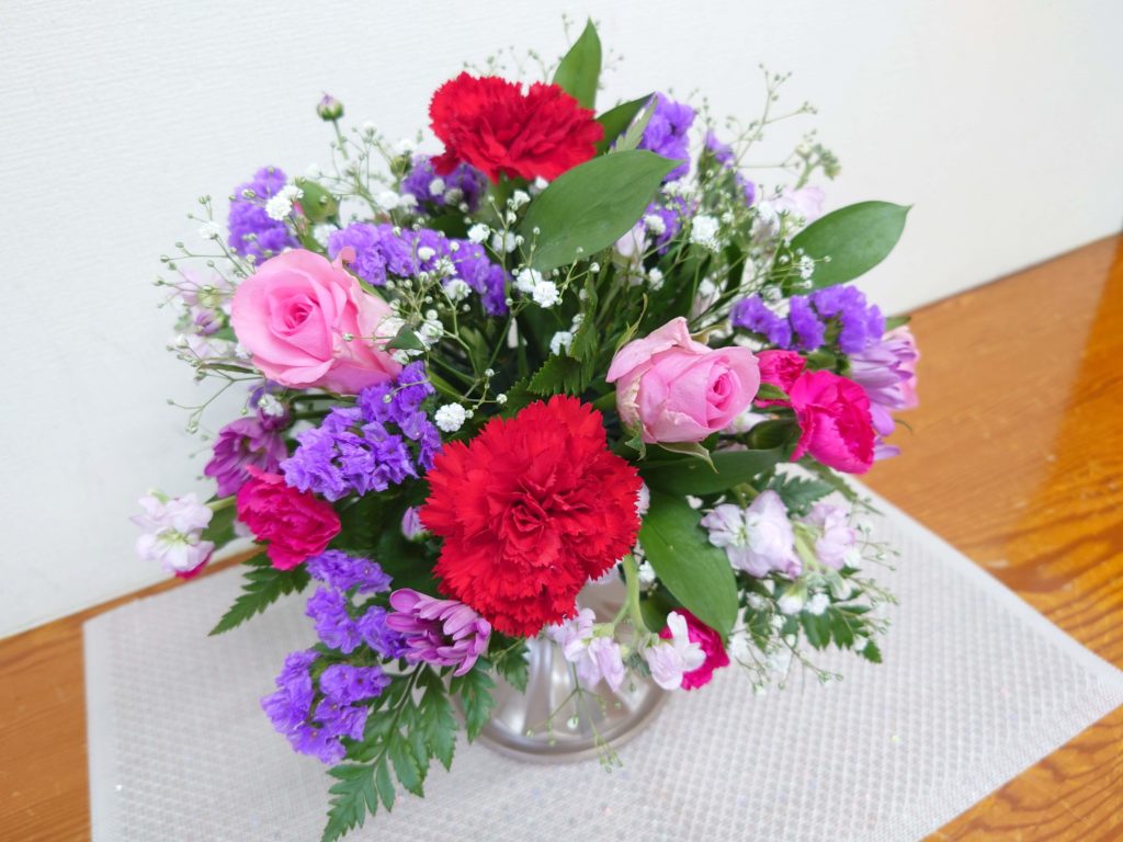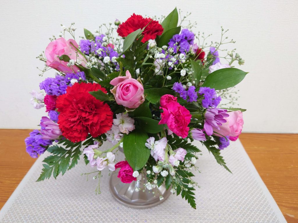 10月はピンクのバラ、ローズ色と赤いカーネーションがメインの秋らしいお花でした。