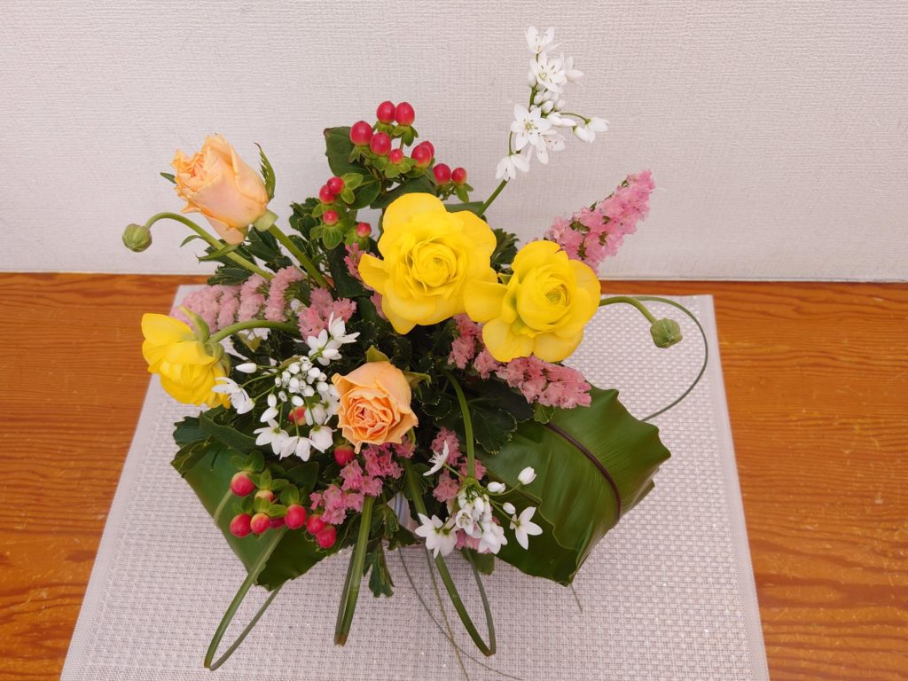 今月のお花はオレンジ色のバラ、黄色鮮やかなラナンキュラスがメイン、