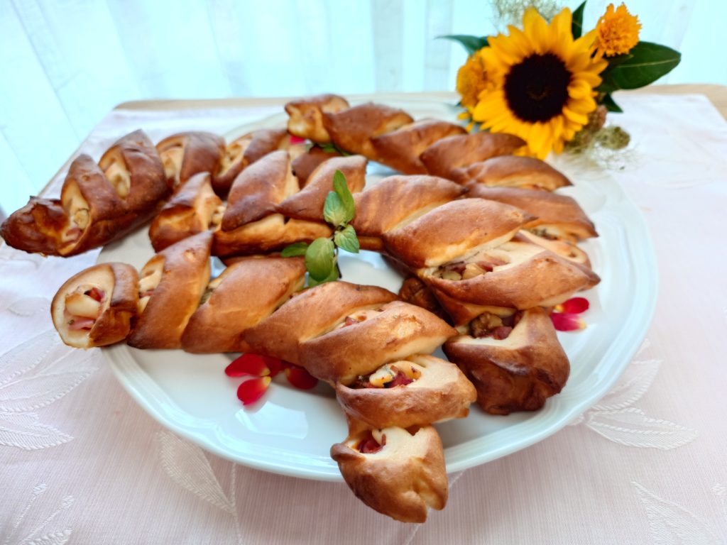 パンの色は🥨プレッツェル風に濃い色で仕上げ,胡桃とトリュフ風味の塩がきいて美味でした。