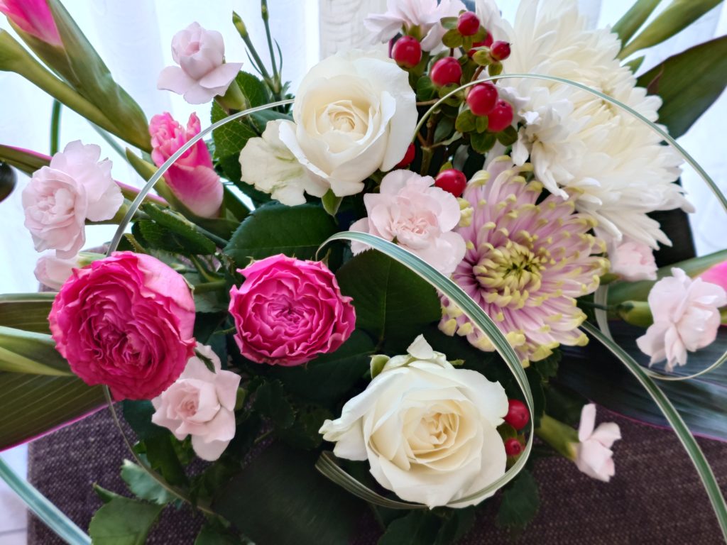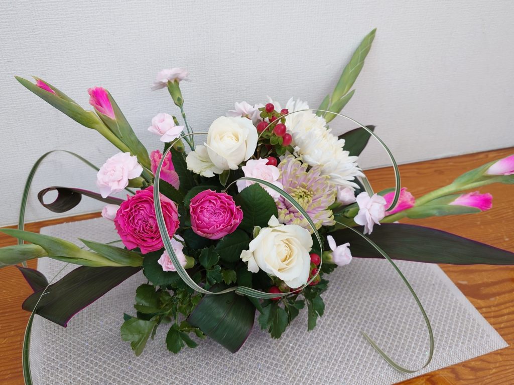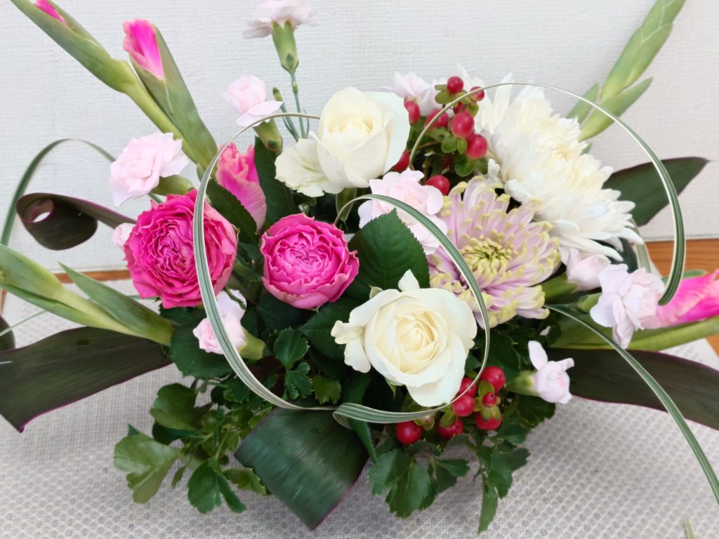 そしてピンクのグラジオラスを使い左右に広がる形のフラワー・アレンジメントを作りました。