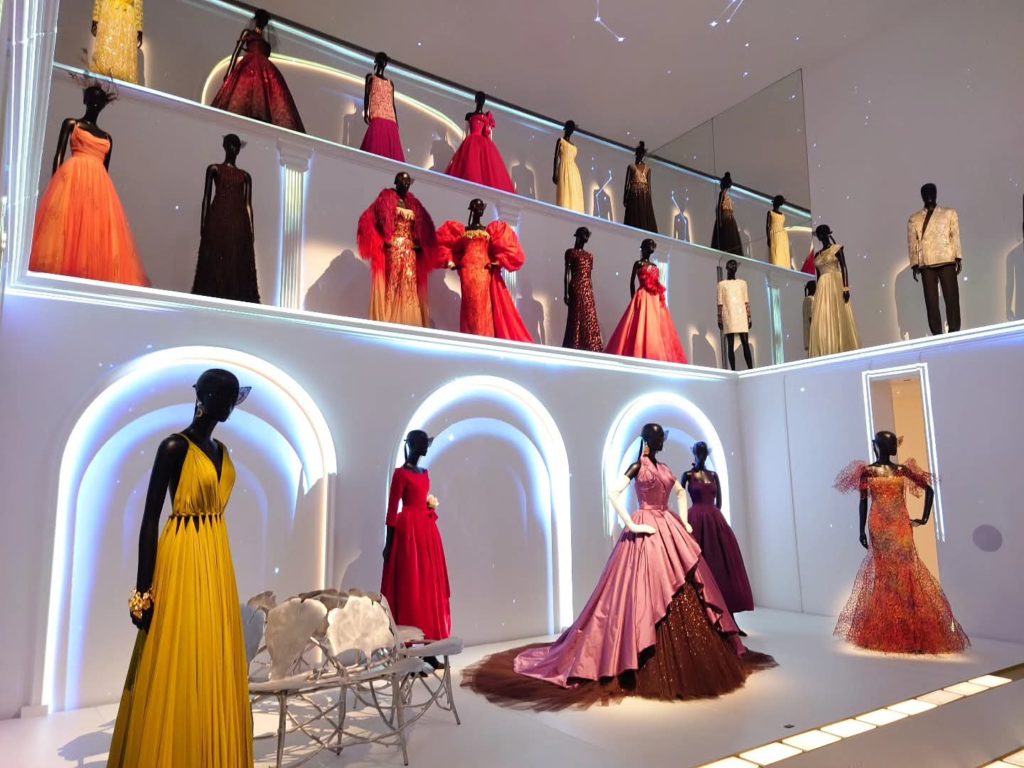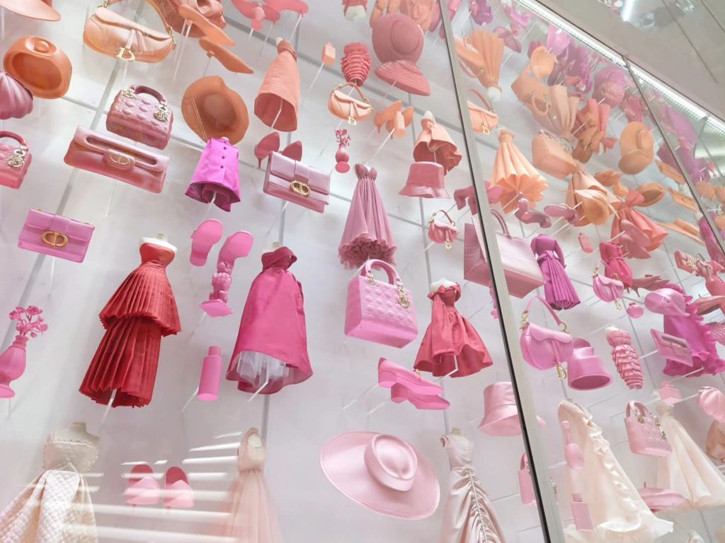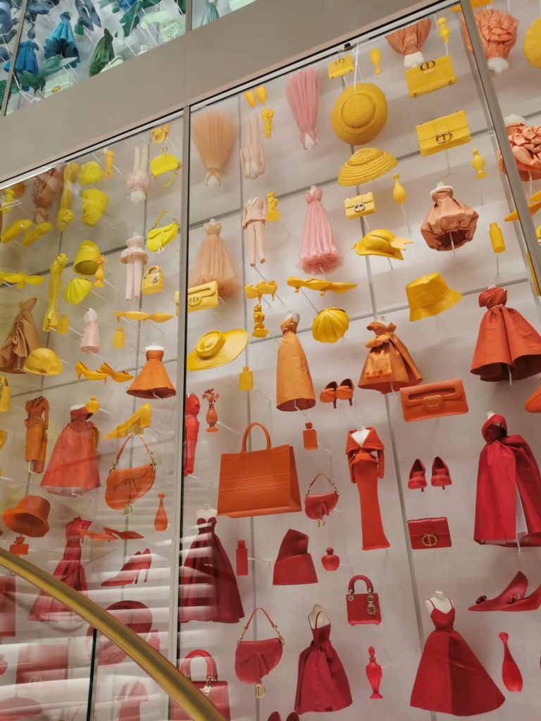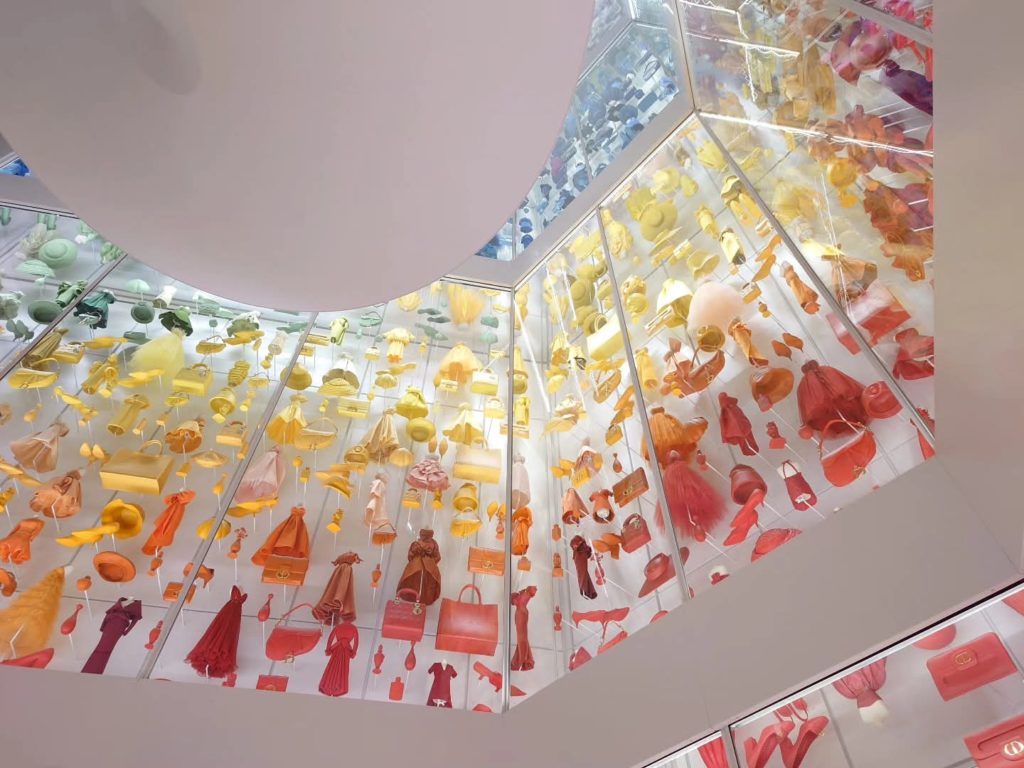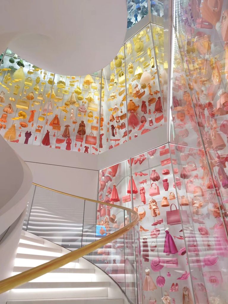 入館してすぐ目に飛び込んでくるのは螺旋階段にディスプレイされているColorfulな🩷🧡💜🩵ミニチュアドレス,バッグetc..
