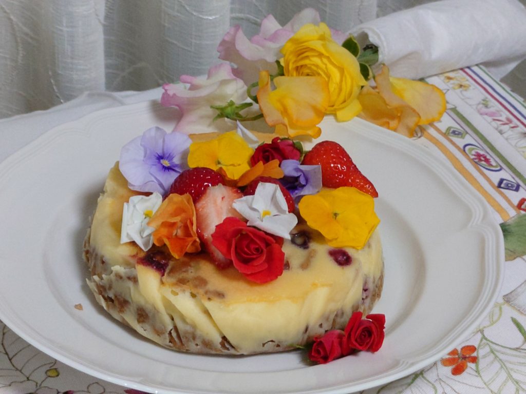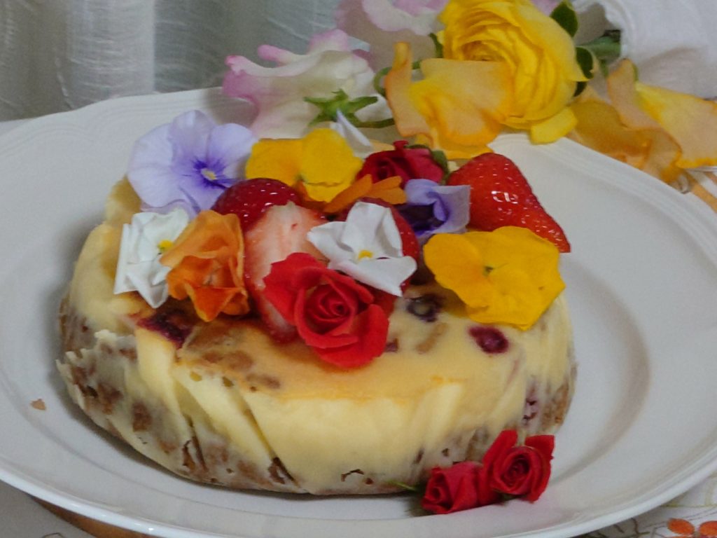 ケーキの飾りつけは🌺Edible Flowers, スイトピー,🍓いちごなどで..