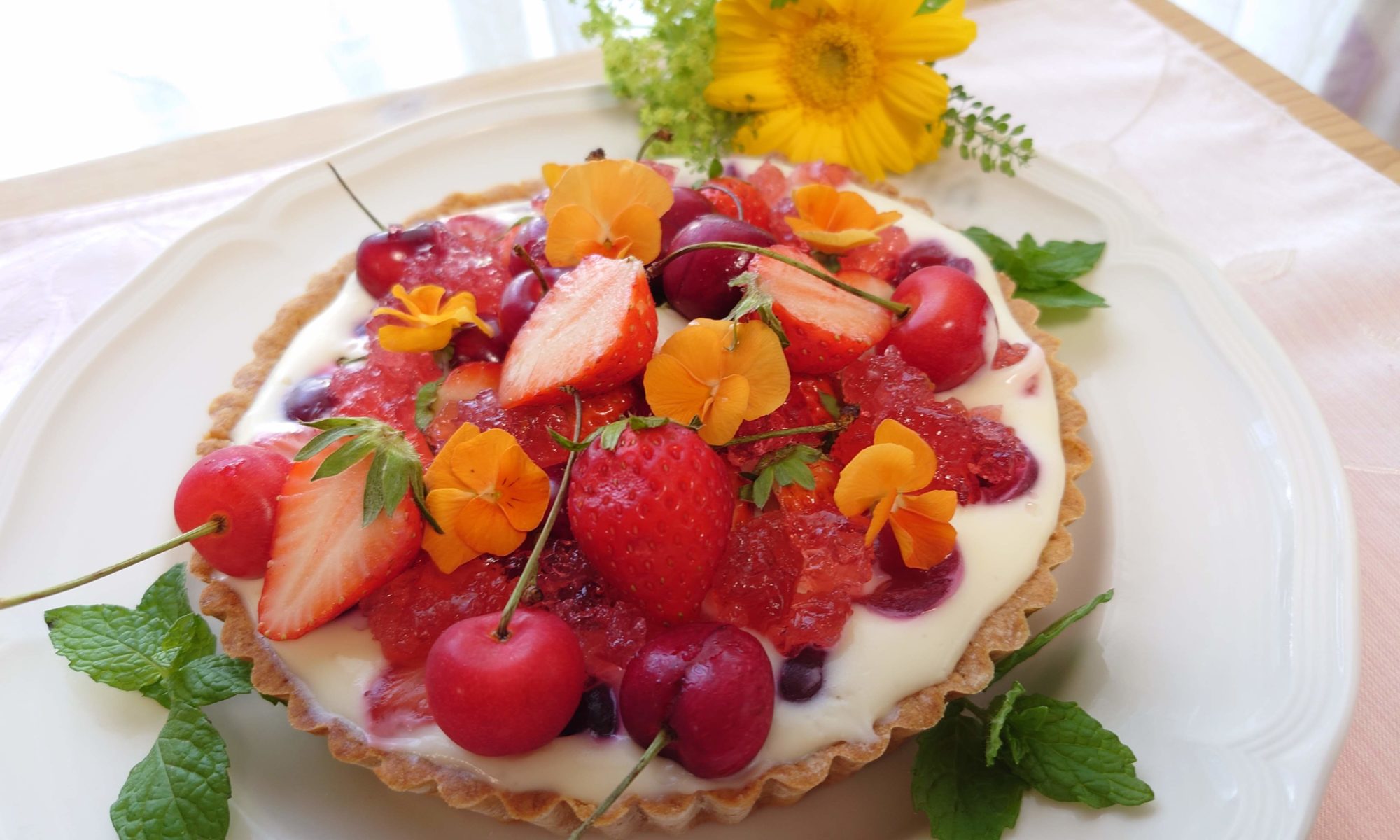 チェリー🍒といちご🍓をちりばめたお花畑のようなタルトを作りました。