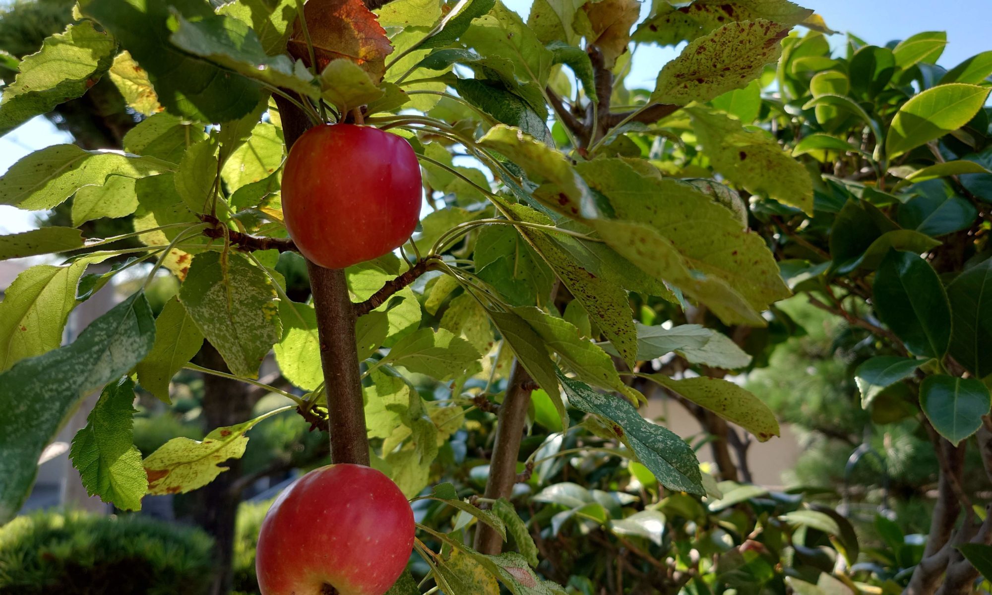 今年はお庭のりんごの木に小さなかわいい姫りんごが二つなりました。