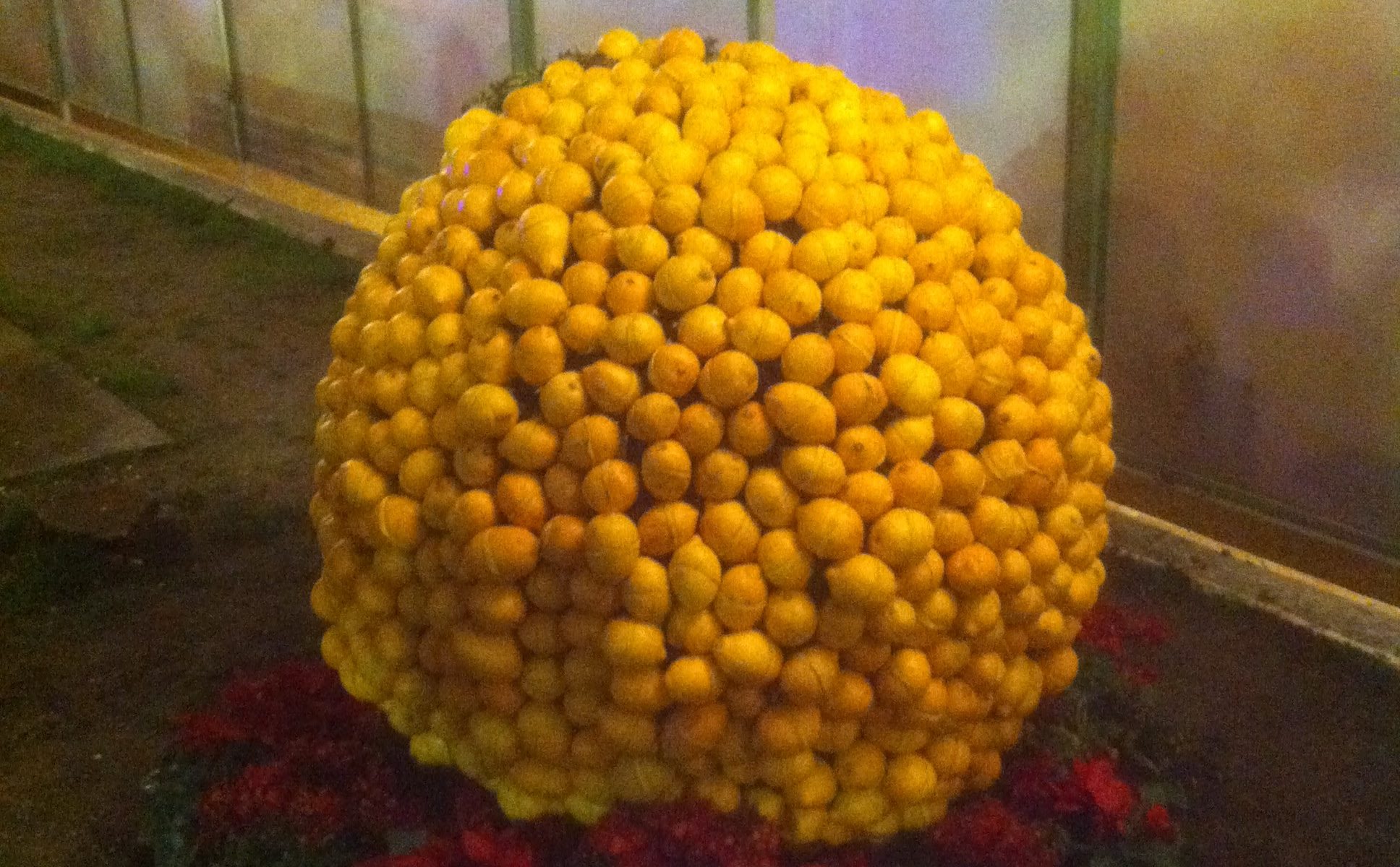 すだちと同じくらいの大きさで黄色がかったオレンジ色、ジュースを絞ると甘酸っぱくてとても美味しいです。